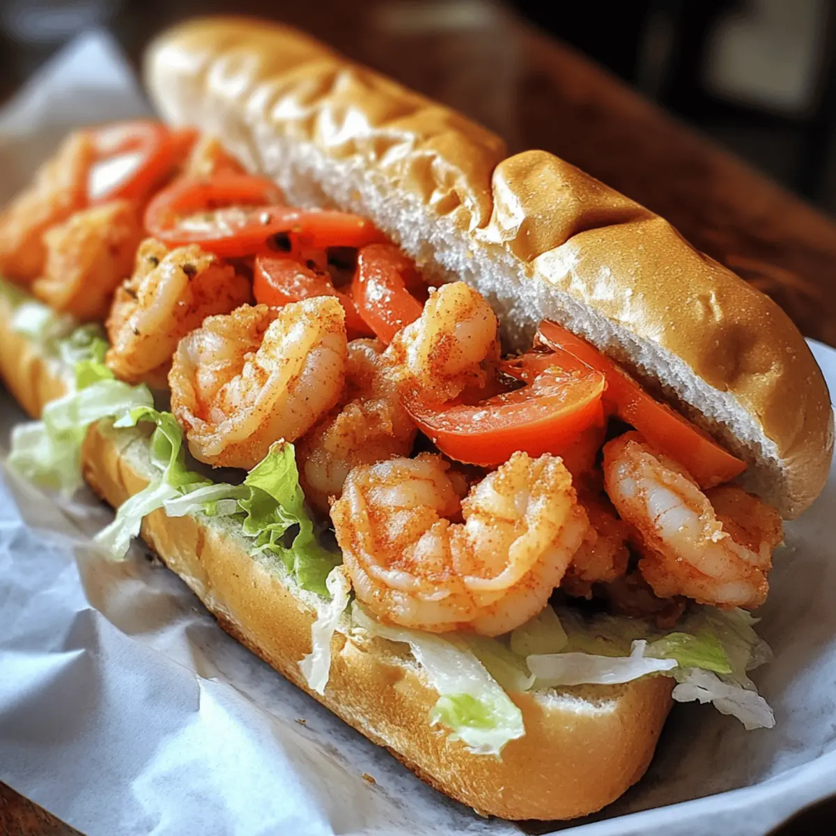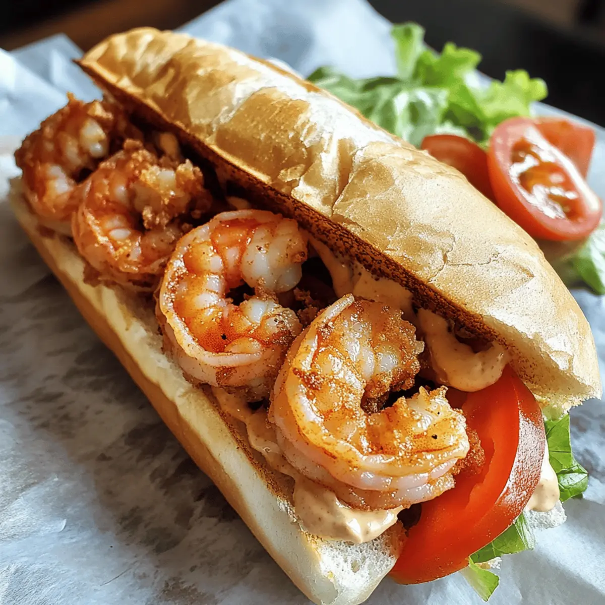 - Assemble Sandwich: Slice baguette lengthwise, spread remoulade on both sides, layer lettuce and tomato, then pile warm shrimp. Press gently to meld flavors.