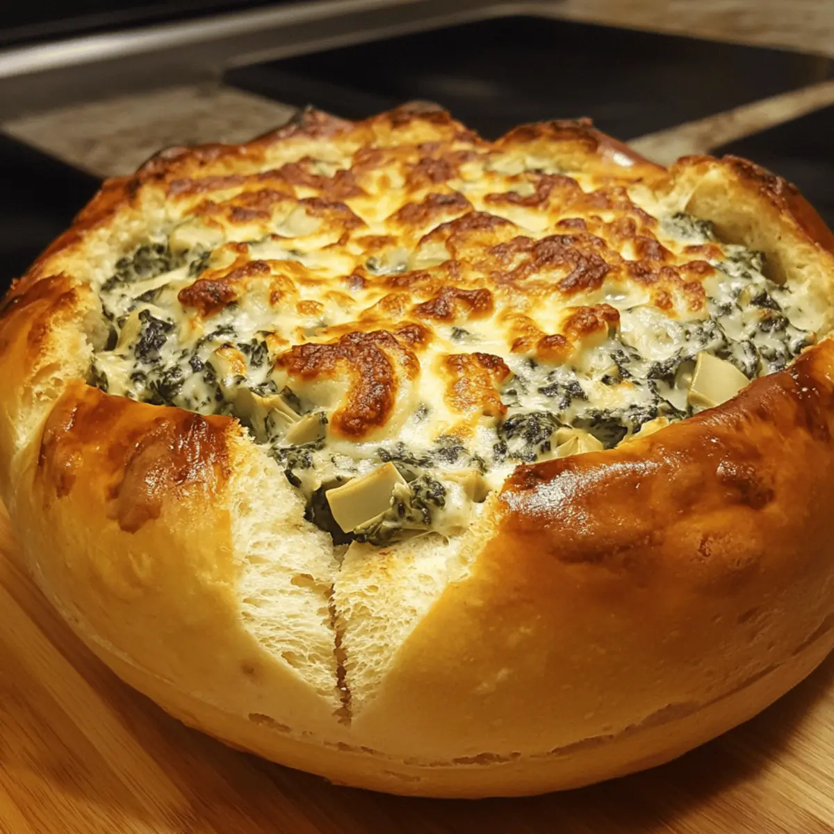 Fill & Bake: Spoon the spinach artichoke dip into the bread bowl, press down gently, bake at 375°F for 15 minutes until cheese is bubbly.