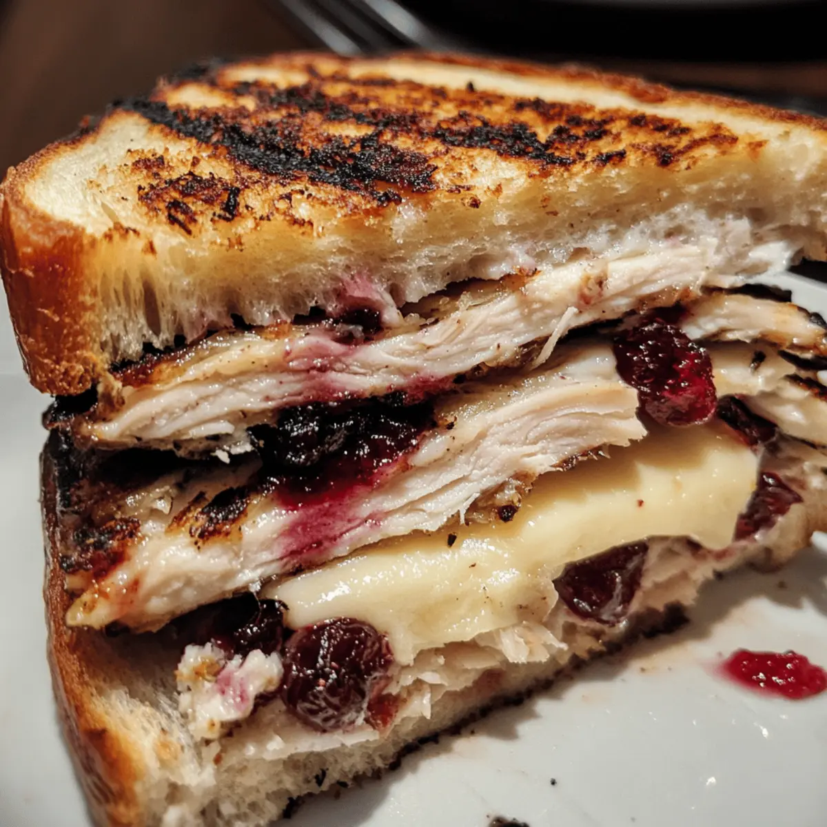 - Assemble sandwich: On the unbuttered sides, layer sliced turkey, Brie wedges, and cranberry sauce. Adjust quantities for even coverage, leaving a ¼-inch border to avoid overflow when grilling.
