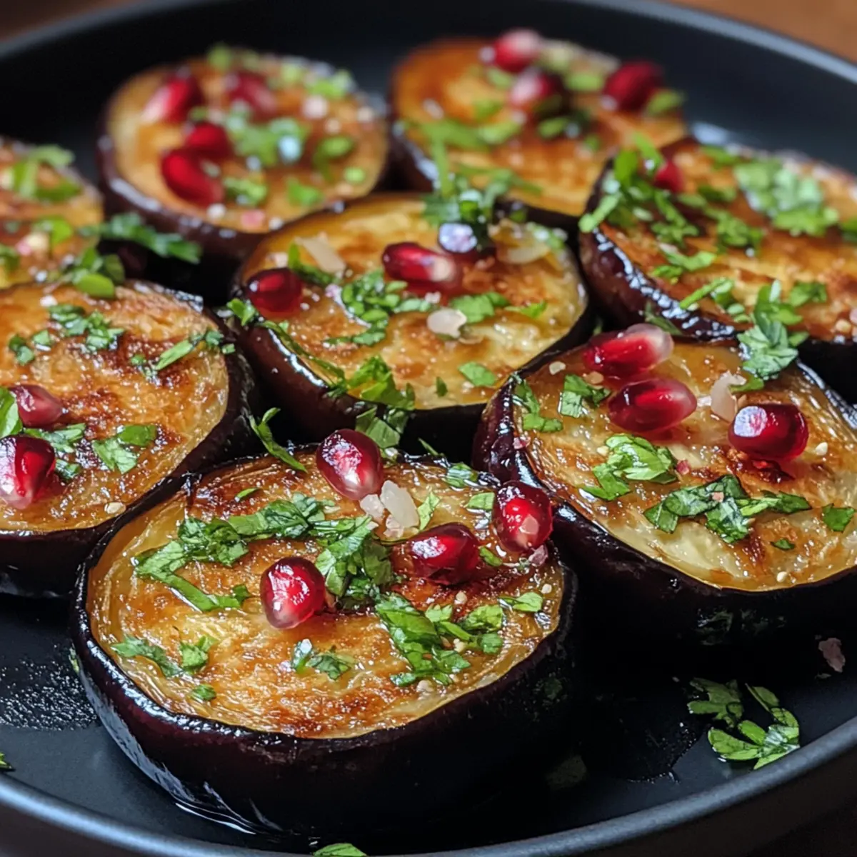 - Plate: Transfer the hot eggplant rounds to a serving platter, then sprinkle the pomegranate-mint mixture over the top, letting jewel-like arils settle into every crevice for maximum flavor contrast.