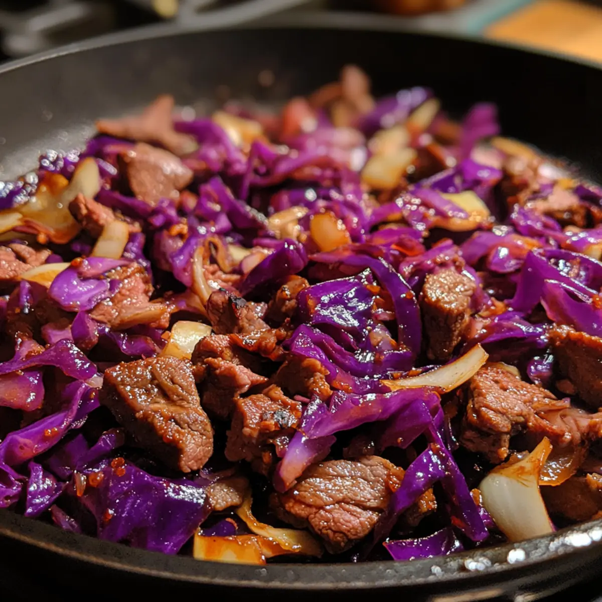 - Glaze mixture: Pour the sauce over the beef and cabbage, tossing gently to coat. Continue cooking for 1–2 minutes until the glaze thickens and beautifully shimmers.