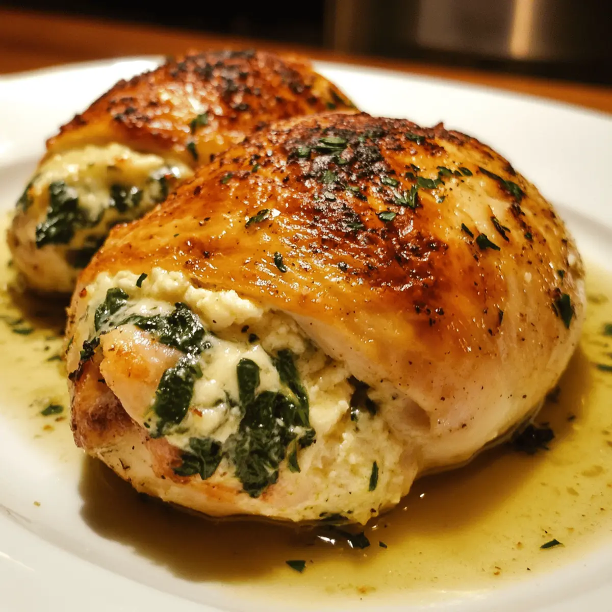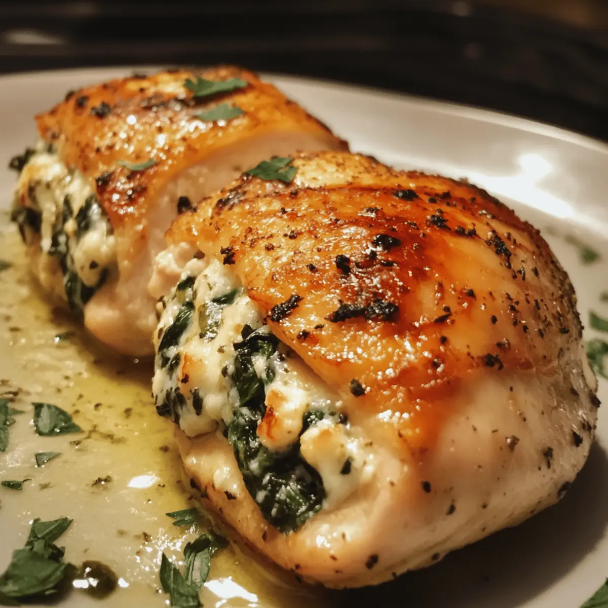 - Fresh spinach – wilted lightly to keep vibrant color and tender texture inside the chicken.
