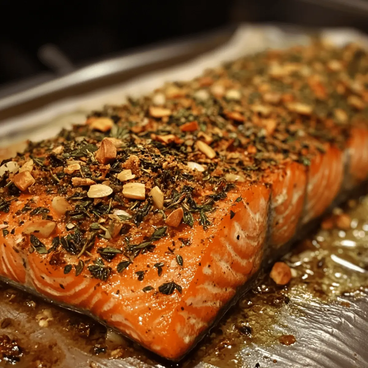 Nutty Crust: Incorporate finely chopped almonds or walnuts into the herb mixture for added crunch and richness. The nutty flavor pairs beautifully with salmon, adding unexpected depth to each bite.