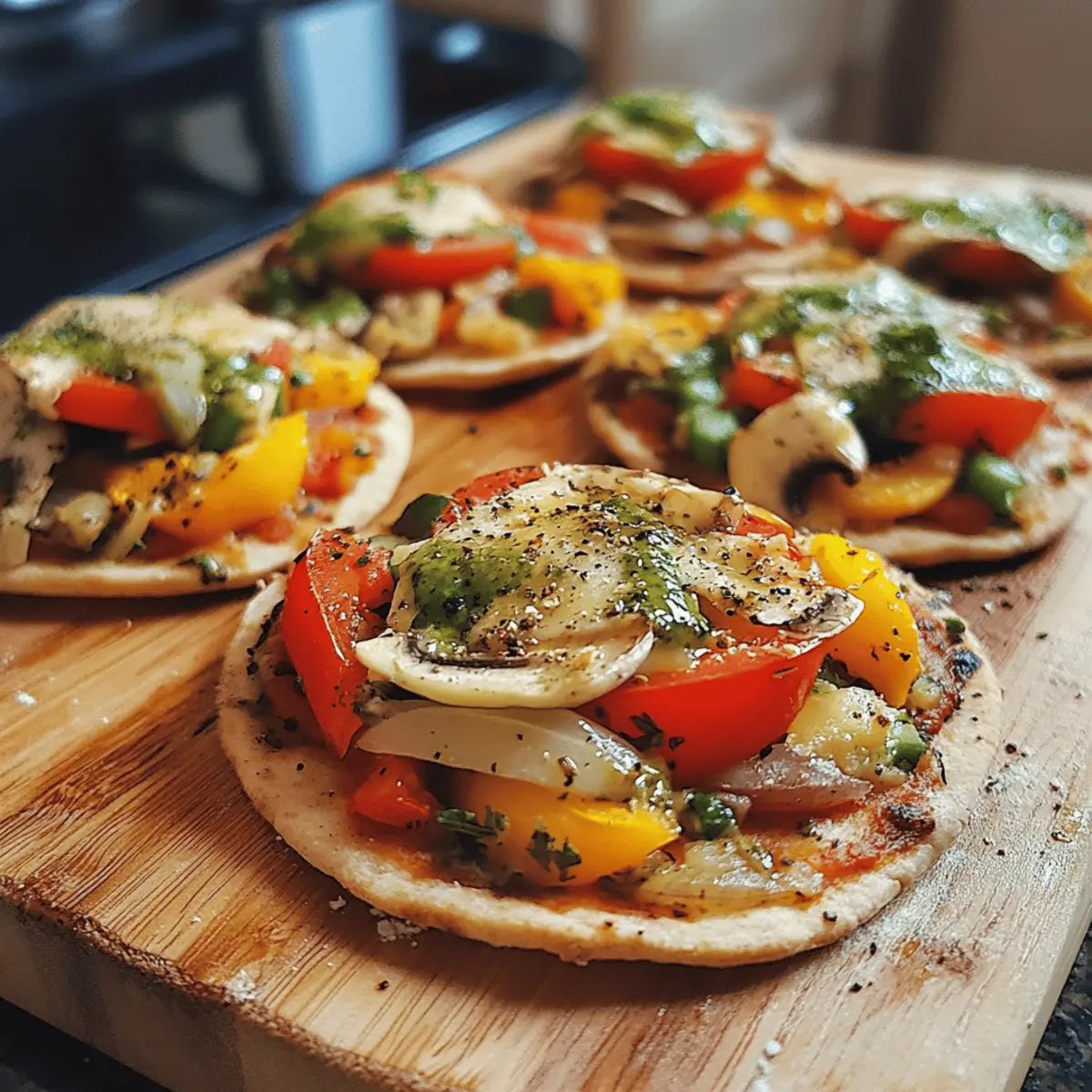 These Mini Veggie Pizzas on Whole Wheat Pita are perfect for meal prep, allowing you to enjoy fresh flavors with minimal effort on busy weeknights! You can prep the whole wheat pitas with olive oil and tomato sauce up to 24 hours in advance; simply cover them tightly in the refrigerator to maintain freshness. The veggie toppings can also be chopped and stored in an airtight container for up to 3 days. When you’re ready to enjoy, just arrange the veggies on the sauce-coated pitas, sprinkle with cheese, and bake at 425°F for 8–10 minutes until bubbly. With these make-ahead options, you’ll have delicious, homemade pizzas ready to savor in no time!