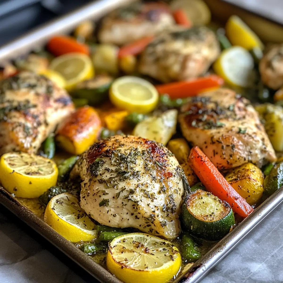 Effortless cooking: Everything roasts together on one pan, cutting prep and cleanup time. Bursting with flavor: Bright lemon and fresh herbs transform simple ingredients into a vibrant meal. Healthy and colorful: A balanced blend of protein and veggies keeps dinner nutritious and visually appealing. Versatile for any occasion: Perfect for busy weeknights or casual family gatherings. Crowd-pleaser guaranteed: Juicy chicken with tender veggies satisfies all taste buds with ease.