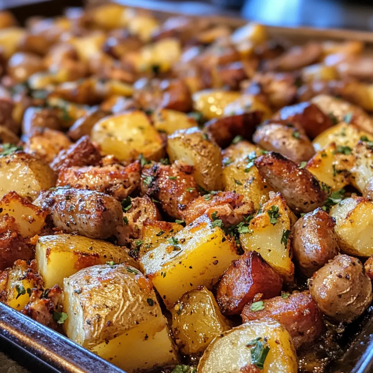 - Rest briefly: Remove pan, let sausages and potatoes rest 5 minutes so juices redistribute and edges crisp up, enhancing flavor and texture before serving.