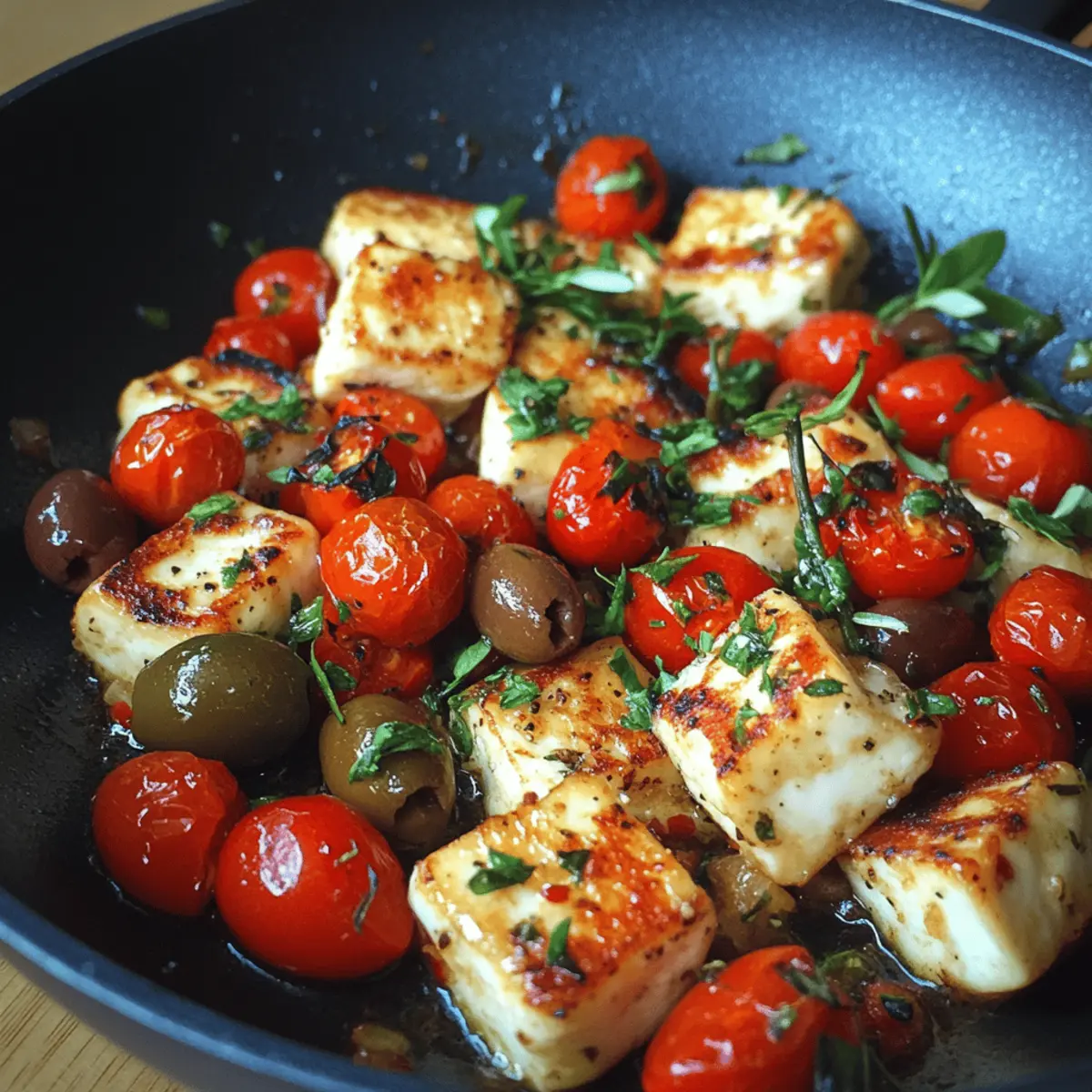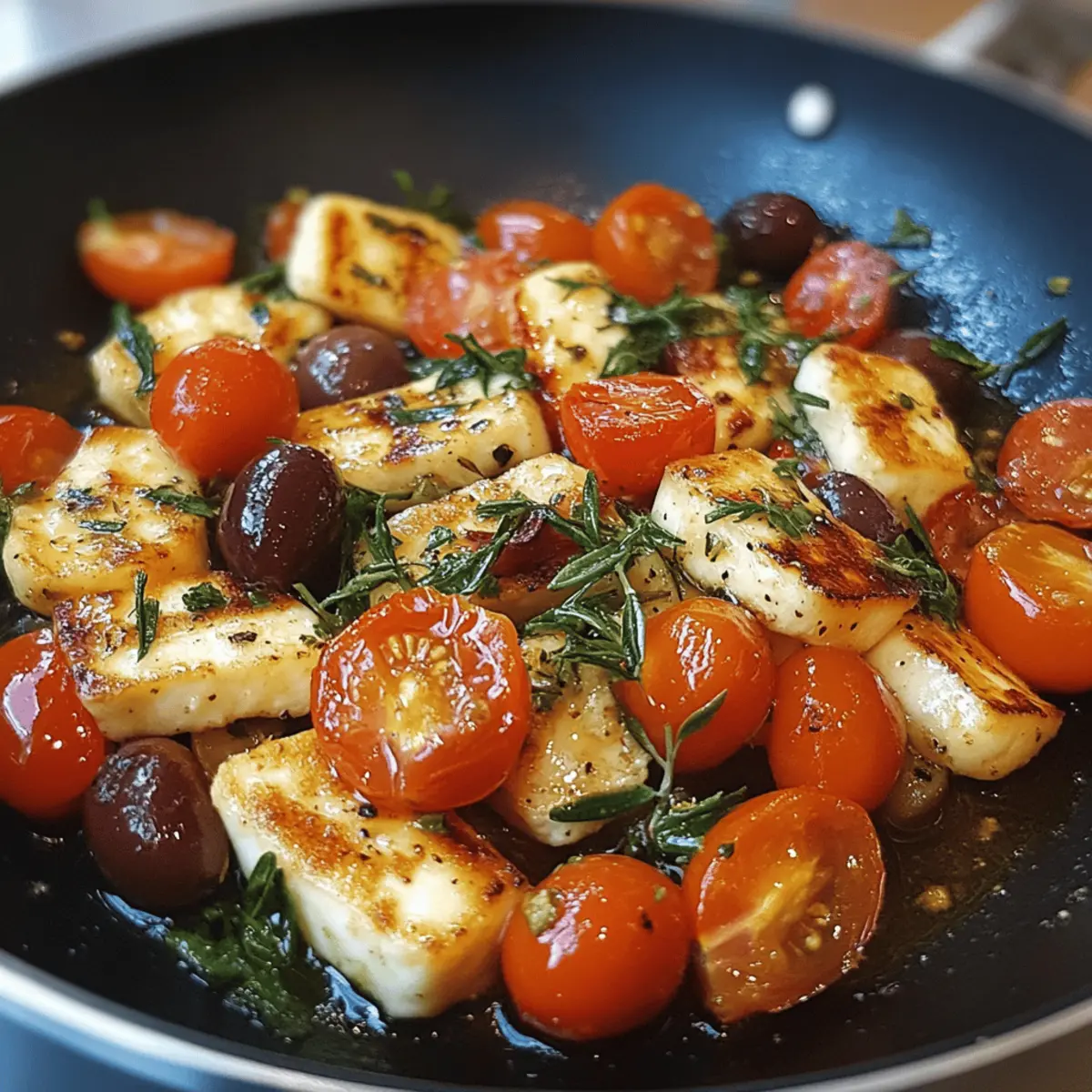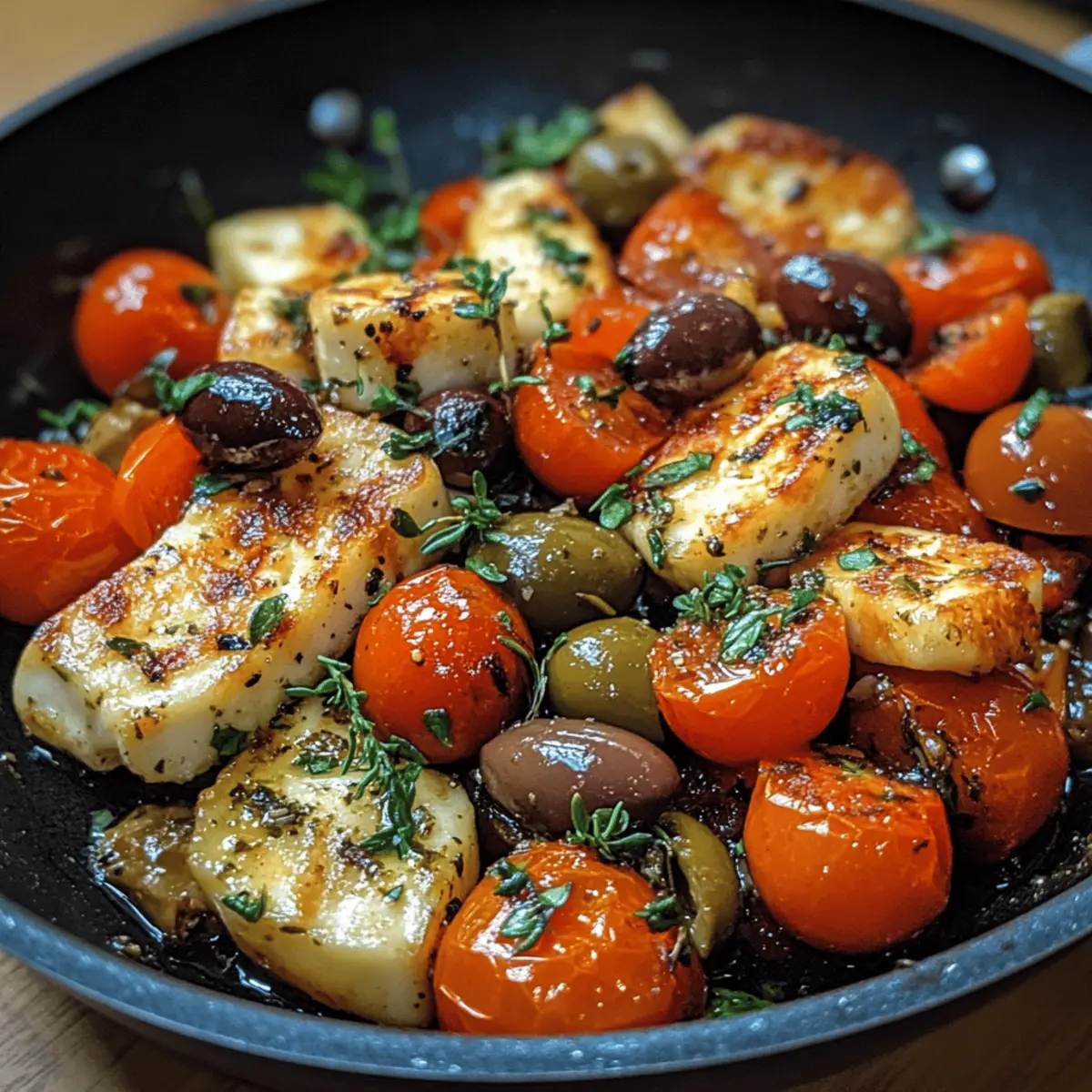 Sauté veggies: Push seared halloumi to the skillet’s edge, add another drizzle of olive oil, then toss in tomatoes and olives. Cook for 2–3 minutes until tomatoes soften and release their juices.