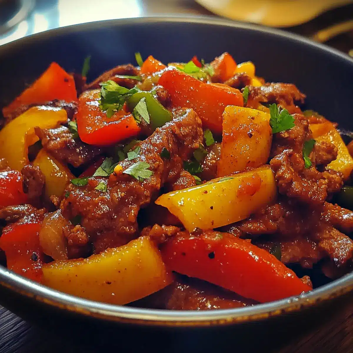 - Season with Spice: Sprinkle in smoked paprika, chili powder, cumin, garlic powder, salt, and pepper. Stir to coat and cook 1–2 minutes more until fragrant, creating that signature smoky chili beef and bell peppers aroma.