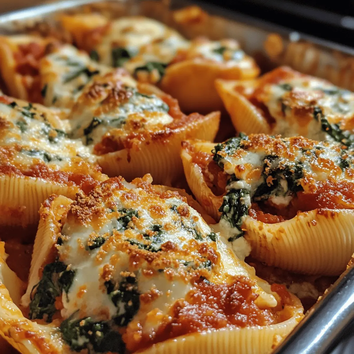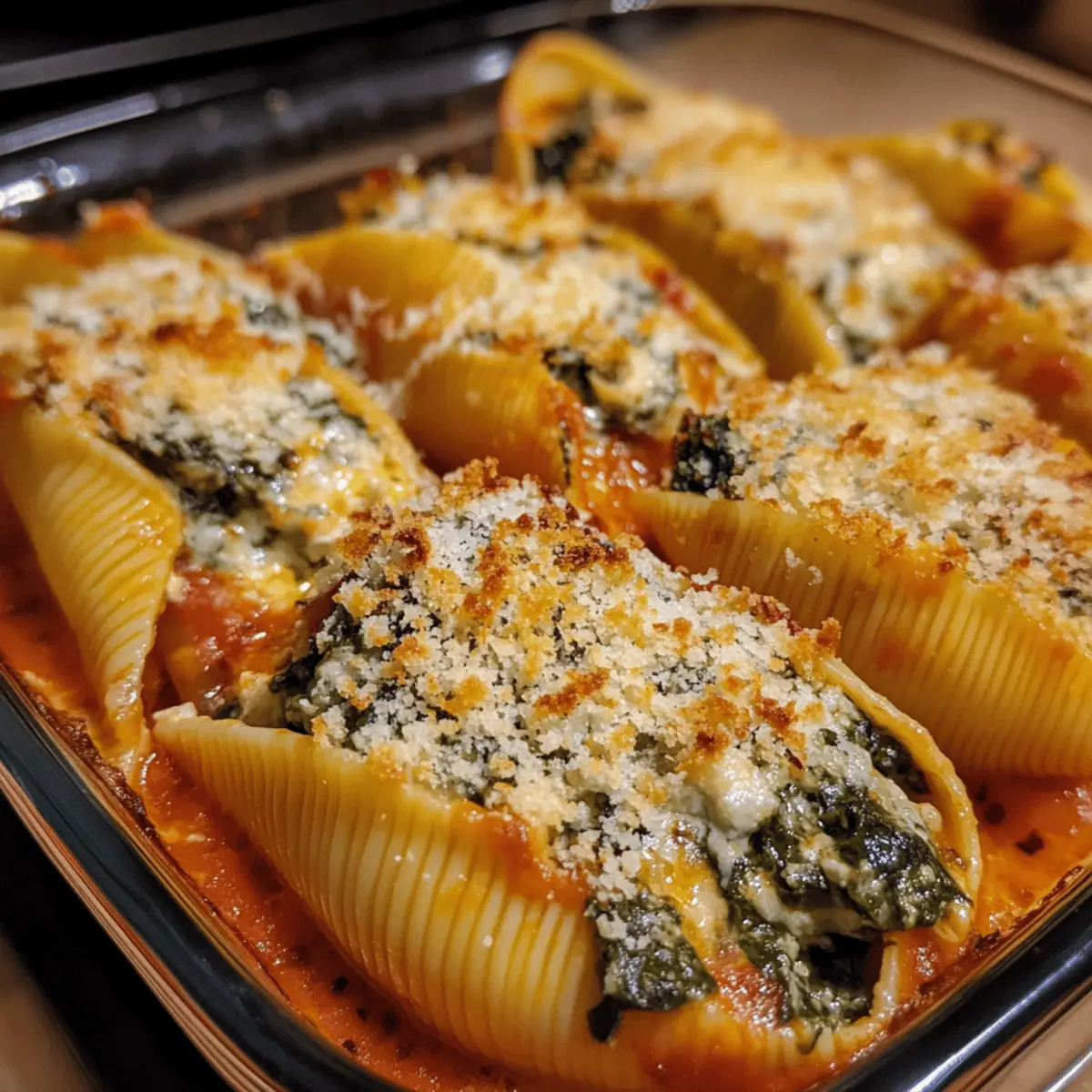 Assemble & Bake: Spread half the marinara sauce in the prepared dish. Arrange stuffed shells seam-side up, pour remaining sauce over them, and scatter shredded mozzarella on top.