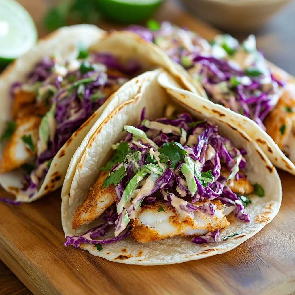 These fish tacos can be prepared in about 30 minutes, making them a perfect choice for a quick weeknight dinner.