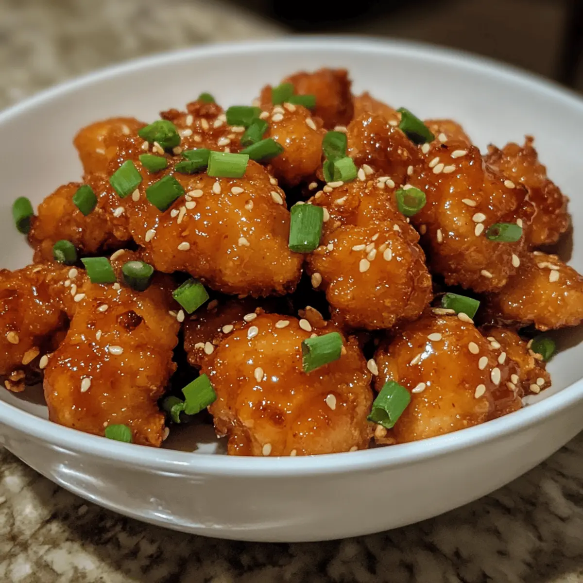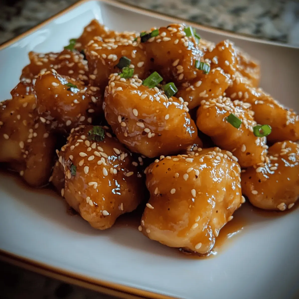 - Garnish & serve: Transfer glazed chicken to a serving platter. Sprinkle with sesame seeds and chopped green onions for color and crunch. Serve immediately to enjoy the perfect contrast of crisp and sticky textures.