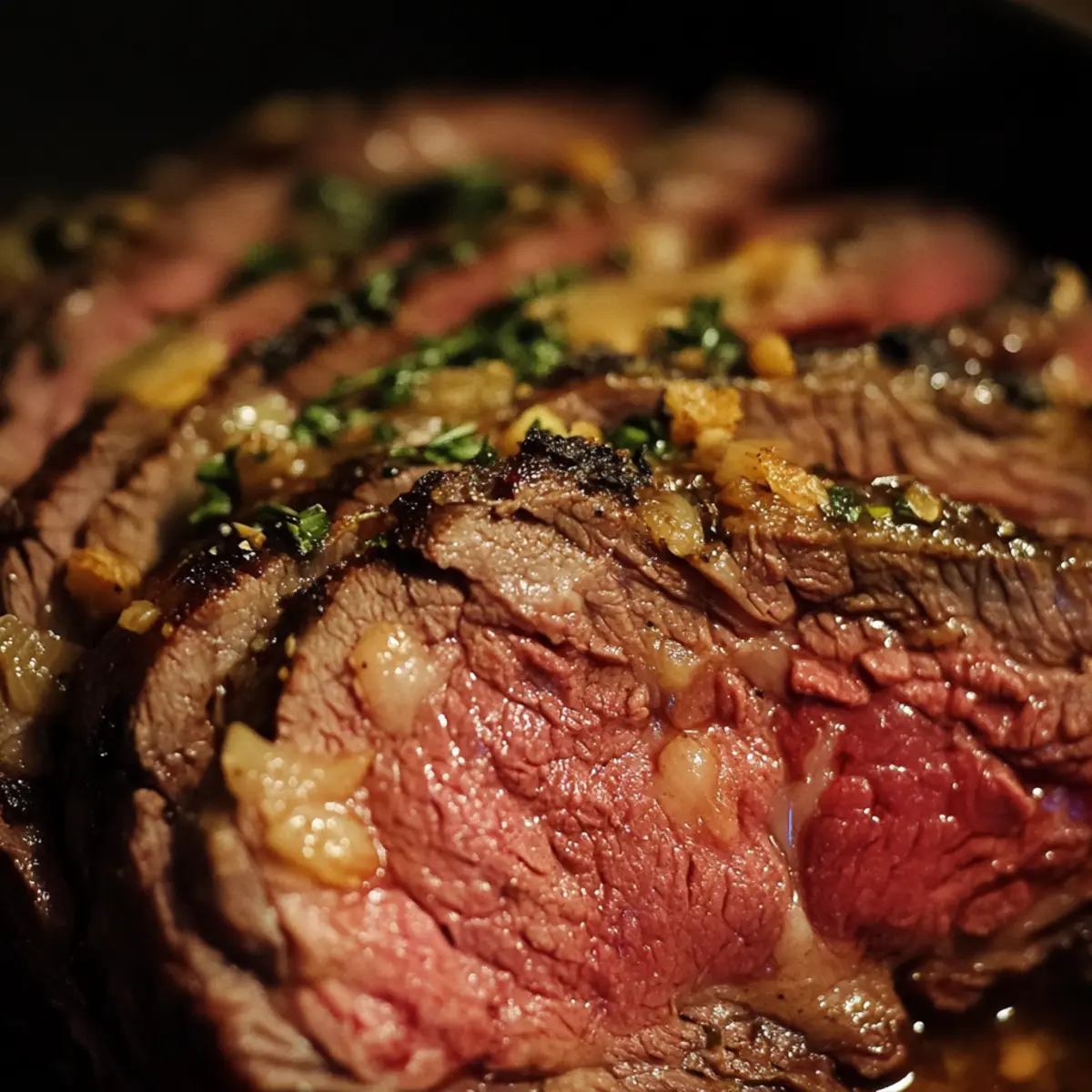 - Carve the roast thinly against the grain, arrange on a platter, and garnish with fresh rosemary.
