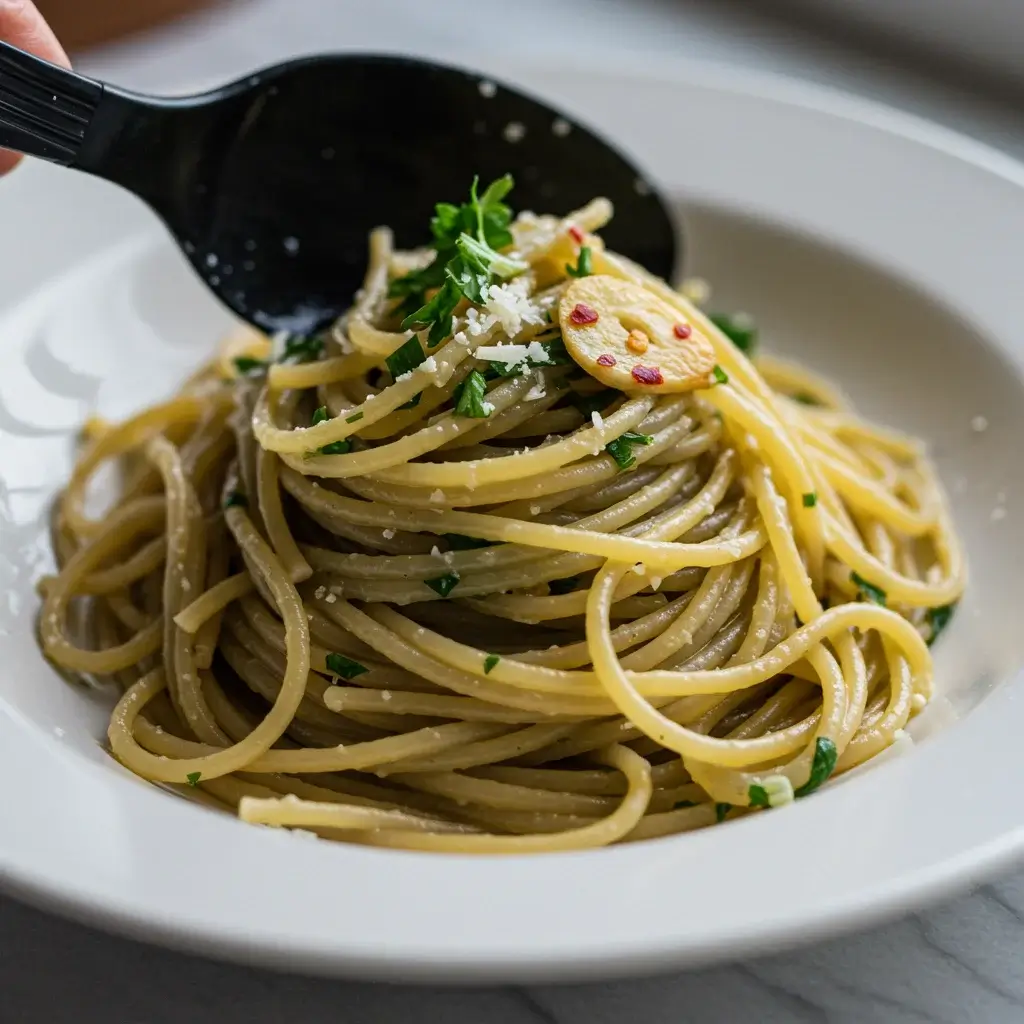 Toss in the drained spaghetti, then remove from heat. Mix in the Parmesan cheese and chopped parsley, ensuring the pasta is well-coated. - Rest and Serve: