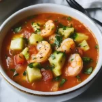 - Serve: Once the gazpacho is thoroughly chilled and you’re ready to serve, give it a good stir. Taste one last time and adjust seasoning if needed (cold soups often need a bit more salt). Ladle the chilled gazpacho into bowls or glasses. Top generously with the prepared chilled shrimp.