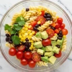 - Combine Ingredients: In a large bowl, combine cooked pasta, black beans, corn, bell peppers, red onion, cherry tomatoes, avocado, and cilantro. Mix gently to ensure even distribution of ingredients.