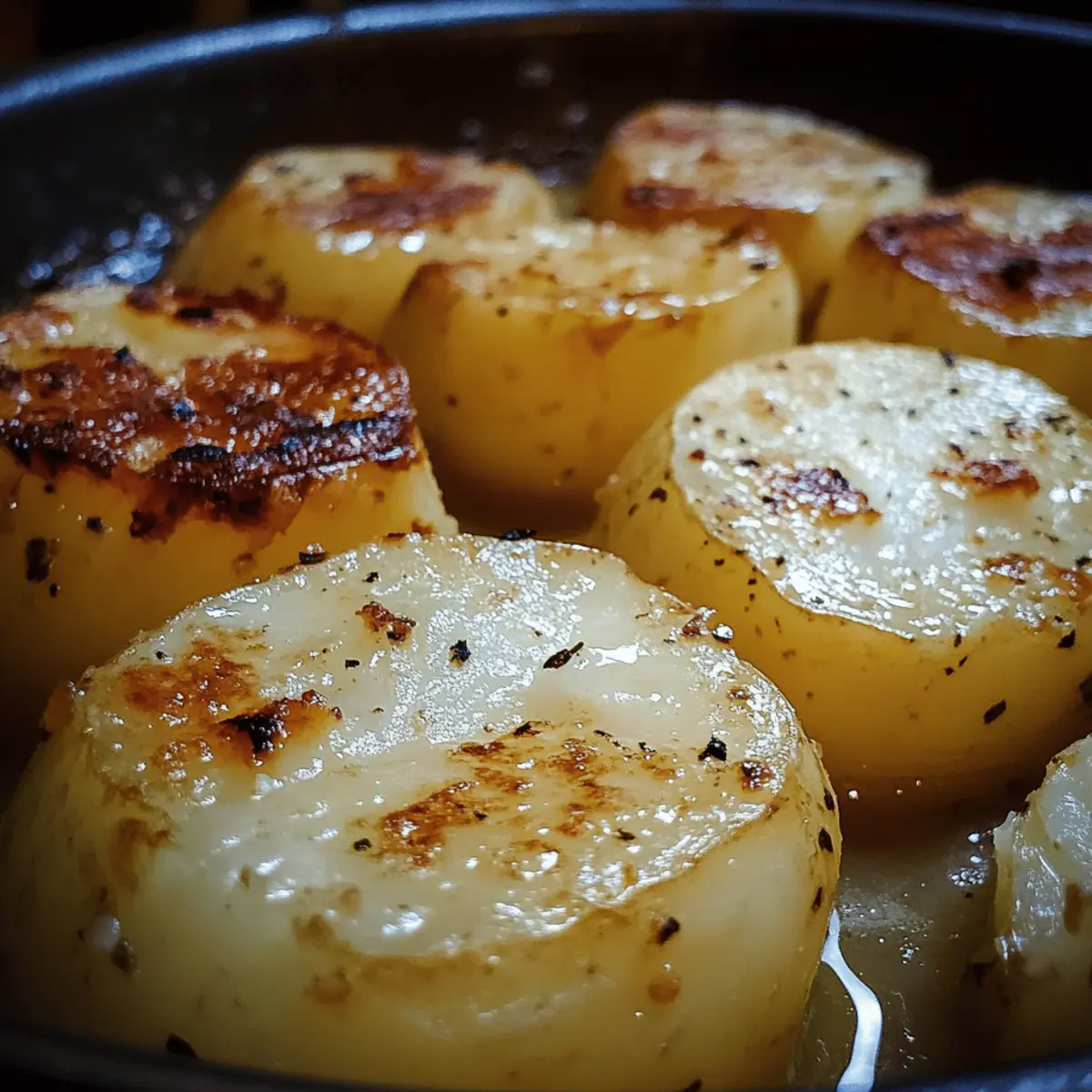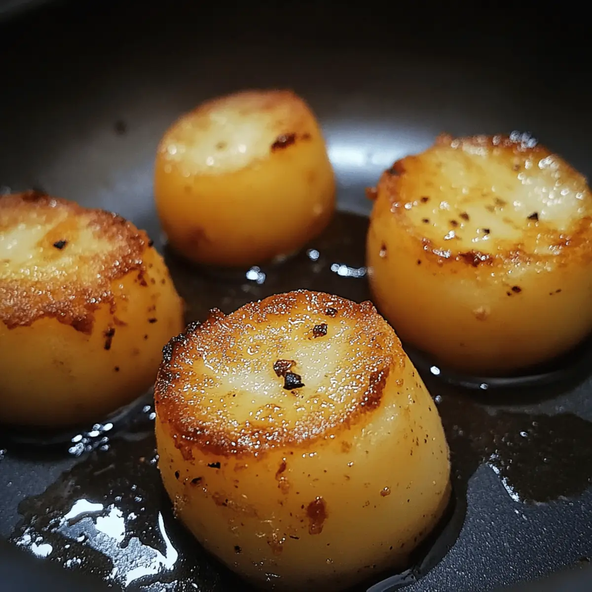 - Arrange potatoes cut-side down in the hot pan. Sear for 3–4 minutes until edges are deep golden.